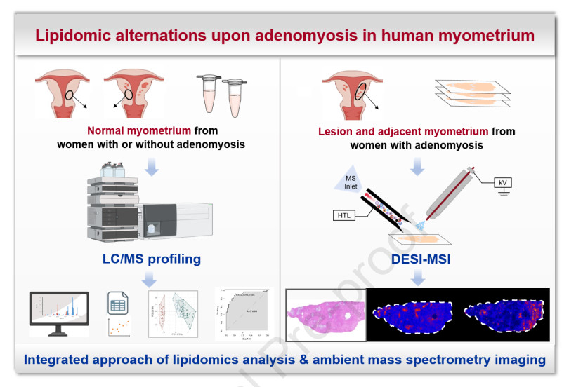 Adenomyosis is a common gynecological disease characterized by the invasion of endometrial glands and stroma into the myometrium of uterus, the pathological mechanism of which remains unclear yet. Disturbed lipid metabolism extensively affects abnormal cell proliferation and invasion in various diseases. However, the lipidome signature of human myometrium, which could be crucial in the development of adenomyosis, remains unknown. In this study, we generated the first lipidome profiling of human myometrium using a high-coverage and quantitative lipidomics approach based on ultra-performance liquid chromatography (UPLC) coupled with triple quadrupole (QqQ)-mass spectrometry (MS). A total of 317 lipid species were successfully quantified in the myometrial tissues from women with (n = 38) or without (n = 65) adenomyosis who underwent hysterectomy at Peking Union Medical College Hospital (Bejing, China). Up to 83 lipid species showed significant alternations in content between the two groups. These lipid aberrations involved multiple metabolic pathways, and emphasized inflammation, cell migration, and immune dysregulation upon adenomyosis. Moreover, receiver operating characteristic (ROC) curve analysis found that the combination of five lipid species could accurately distinguished the myometrial samples from women with and without adenomyosis with an area under the curve (AUC) of 0.906. Desorption electrospray ionization MS imaging (MSI) further underscored the heterogeneous distributions of these lipid markers in the adenomyosis lesion and adjacent myometrial tissue. Collectively, these results extremely improved our understanding on the molecular basis of adenomyosis, and could shed light on developing potential biomarkers and new therapeutic directions for adenomyosis.