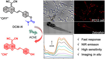 Acetylcholinesterase (AChE) plays a crucial role in the activities of the nervous system, and its abnormal function can lead to the occurrence and development of neurodegenerative diseases. Hence, an effective method for real-time monitoring of AChE activity is essential. Very recently, several fluorescence sensors have been developed for the detection of AChE activity, but they are usually imaging in the visible region, relatively small Stokes shifts, or long response times, limiting their application for real-time monitoring in vivo. Inspired by that, a near-infrared (NIR) off-on probe ((E)-4-(2-(4-(dicyanomethylene)-4H-chromen-2-yl)vinyl)phenyl dimethylcarbamate, DCM-N) for AChE monitoring with high selectivity and sensitivity is developed. In the probe DCM-N, a bright near-infrared fluorescence emission at 700 nm can be triggered by AChE through the cleavage of amino ester bond in DCM-N, and the resulting fluorescence exhibits a good linear relationship with AChE activity in the range of 0.2–16 U/mL, with a detection limit as low as 0.06 U/mL. For real plasma sample detection, DCM-N demonstrates advantages of accurate detection and fast response compared to the traditional Ellman assay for AChE detection. Moreover, DCM-N can be used for imaging of AChE activity in live cells and tracking of AChE activity in zebrafish models, which is of great significance for medical and physiological research related to AChE. DCM-N possesses several notable features such as light-up NIR emission, fast response, large spectral shifts and strong photostability under physiological conditions. These features enable it to monitor AChE activity both in vivo and in vitro, providing a suitable tool for real-time monitoring and in vivo visualization of AChE activity.