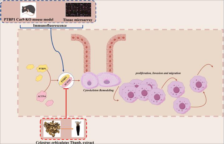 Adjuvant chemoradiotherapy, molecular targeted therapy, and immunotherapy are frequently employed to extend the survival of patients with advanced gastric cancer (GC). However, most of these treatments have toxic side effects, drug resistance, and limited improvements in survival and quality of life. Therefore, it is crucial to discover and develop new medications targeting GC that are highly effective and have minimal toxicity. In previous studies, the total terpene extract from the stem of Celastrus orbiculatus demonstrated anti-GC activity; however, the specific mechanism was unclear. Our research utilising co-immunoprecipitation-mass spectrometry (Co-IP-MS), polypyrimidine tract binding protein 1 (ptbp1) clustered regularly interspaced short palindromic repeat-associated protein 9 (Cas9)-knockout (KO) mouse model, tissue microarray, and functional experiments suggests that alpha actinin-4 (ACTN4) could be a significant biomarker of GC. PTBP1 influences actin cytoskeleton restructuring in GC cells by interacting with ACTN4. Celastrus orbiculatus stem extract (COE) may directly target ACTN4 and affect the interaction between PTBP1 and ACTN4, thereby exerting anti-GC effects.
