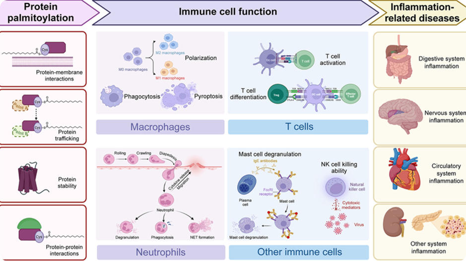 S-palmitoylation represents a dynamic and reversible modification wherein palmitate forms covalent bonds with cysteine residues in proteins, thereby modifying their localization, stability, signaling pathways, and protein-protein interactions. Aberrations in S-palmitoylation are associated with the progression of various diseases, particularly inflammatory conditions. This association can be attributed to its regulation of pattern recognition receptors (PRRs) and its influence on immune cell functions, including macrophages, T cells, neutrophils, and natural killer cells (NK cells). This review synthesizes current knowledge regarding the impact of S-palmitoylation on inflammation-related diseases through examination of its regulatory roles in PRRs and immune cell functions. The objective is to illuminate the underlying mechanisms and regulatory networks involved in inflammation-related diseases.