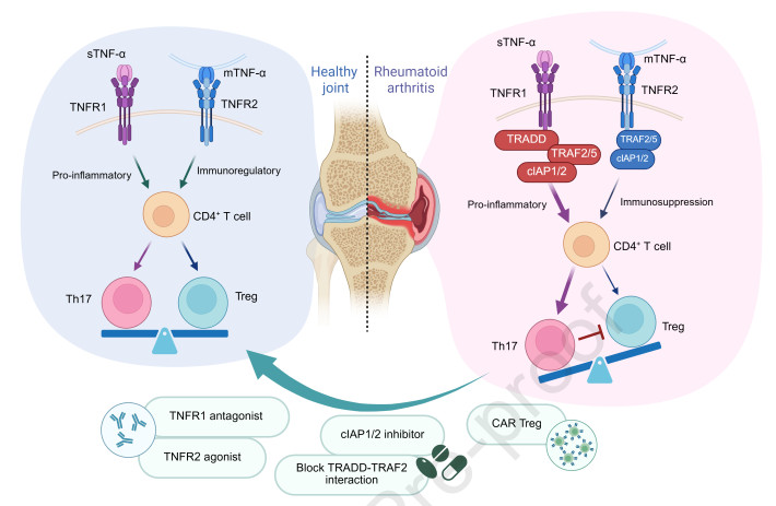 The pleiotropic regulatory effect of tumor necrosis factor-alpha (TNF-α), an essential cytokine involved in immune regulation, is of significant importance in the immune response. TNF-α inhibitors have been widely used in rheumatoid arthritis (RA) and other autoimmune diseases since their introduction into clinical practice. However, the tradeoff between its excellent efficacy and adverse drug reactions (ADR) remains a problem. T cells, especially the T helper cell 17 (Th17)/regulatory T (Treg) cells balance, are crucial for the treatment of autoimmune diseases including RA. This review explores the mechanisms by which TNF-α/TNF receptor (TNFR) signaling induces Th17/Treg imbalance in RA. This review synthesizes current knowledge to facilitate an improved understanding of the causes of ADR, such as infection caused by TNF-α inhibitors in clinical practice. Moreover, our findings offer a reference for exploring potential TNF-α/TNFR signaling inhibitory strategies from the perspective of regulating T cell balance.
