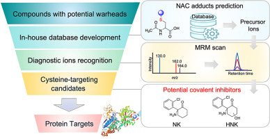 Targeted covalent inhibitors, primarily targeting cysteine residues, have attracted great attention as potential drug candidates due to good potency and prolonged duration of action. However, their discovery is challenging. In this research, a database-assisted liquid chromatography-tandem mass spectrometry (LC-MS/MS) strategy was developed to quickly discover potential cysteine-targeting compounds. First, compounds with potential reactive groups were selected and incubated with N-acetyl-cysteine in microsomes. And the precursor ions of possible cysteine-adducts were predicted based on covalent binding mechanisms to establish in-house database. Second, substrate-independent product ions produced from N-acetyl-cysteine moiety were selected. Third, multiple reaction monitoring scan was conducted to achieve sensitive screening for cysteine-targeting compounds. This strategy showed broad applicability, and covalent compounds with diverse structures were screened out, offering structural resources for covalent inhibitors development. Moreover, the screened compounds, norketamine and hydroxynorketamine, could modify synaptic transmission-related proteins in vivo, indicating their potential as covalent inhibitors. This experimental-based screening strategy provides a quick and reliable guidance for the design and discovery of covalent inhibitors.