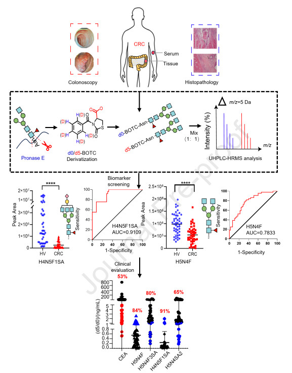 Colorectal cancer (CRC) is a prevalent gastrointestinal malignancy. However, the lack of diagnostic accuracy of traditional clinical serum biomarkers carcinoembryonic antigen (CEA) and cancer antigen 19-9 (CA19-9) results in patients being diagnosed at an advanced stage. Herein, we developed a novel method of ultrahigh-performance liquid chromatography coupled to quadrupole-Orbitrap high-resolution mass spectrometry (UHPLC-Q-Orbitrap HRMS) for relative quantification based on the non-specific enzyme pronase E and an isotope mass spectrometry (MS) probe 3-benzoyl/(benzoyl-2,3,4,5,6-d5)-2-oxothiazolidine-4-carboxylic acid (d0/d5-BOTC) to screen novel glycan biomarkers. We applied the method in a cohort of 102 serum samples (including 51 healthy volunteers (HV), 26 stage II CRC, and 25 stage III CRC) and 90 tissue samples (including 45 paracancerous tissue and 45 cancerous tissue). Results revealed that the serum levels of H5N4F, H5N4F3SA, H4N5F1SA, and H5N4SA2 in CRC patients were significantly different from those in HV (P < 0.01). The area under the curve values of H5N4F, H5N4F3SA, and H4N5F1SA in serum samples were 0.77, 0.71, and 0.91, respectively. The clinical diagnostic accuracies of these glycans ranged from 65% to 91%, which were significantly higher than those of CEA. Additionally, differential glycan profiles in tissues were further examined using the same method and compared with serum levels. H5N4F was found to be significantly down-regulated in all CRC groups (P < 0.0001), indicating strong specificity for CRC diagnosis. The glycans identified in this study are expected to serve as potential biomarkers for the early diagnosis of CRC, offering valuable reference points for clinical diagnosis and treatment.