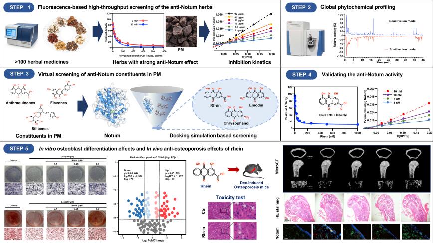 Osteoporosis, a severe systemic skeletal disorder characterized by decreased bone mineral density, leads to increased risks of bone fragility and fracture. Although some herbal medicines (HMs) are clinically used for treating osteoporosis, the crucial anti-osteoporotic constituents and their mechanisms have not been well-elucidated. Notum, a negative regulator of Wnt/β-catenin signaling, has been validated as a druggable target for enhancing cortical bone thickness and alleviating osteoporosis. Herein, we showcase an efficient strategy for uncovering the key anti-Notum constituents from HMs via integrating biochemical, phytochemical, computational, and cellular assays. Following screening the anti-Notum potentials of HMs, Polygonum multiflorum Thunb. (PM), a commonly used anti-osteoporosis herb, showed potent and competitive inhibition against Notum. Phytochemical profiling coupling with docking-based virtual screening suggested that three anthraquinones, including rhein, emodin, and chrysophanol, showed high binding-potency towards Notum. Biochemical assays validated that three anthraquinones were strong competitive inhibitors of Notum, while rhein was the most potent one (IC50 = 9.98 nM). Cellular investigations demonstrated that rhein markedly promoted osteoblast differentiation in dexamethasone-challenged MC3T3-E1 osteoblasts, while RNA sequencing showed that rhein remarkably regulated Wnt signaling-related and osteogenic differentiation-related genes. In vivo tests showed that rhein displayed favorable safety profiles in healthy mice and this agent significantly elevated bone mineral density, and augmented trabecula and cortical bone thickness in dexamethasone-induced osteoporotic mice. Collectively, this study showcases an efficient strategy for uncovering the key anti-Notum constituents from HMs, while rhein was identified as a naturally occurring Notum inhibitor that shows favorable safety profiles and impressive anti-osteoporosis effects.